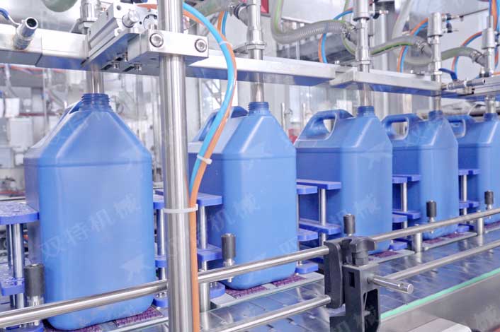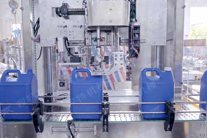 雙特機械稱重式灌裝生產線適用于5-200L的稱重計量灌裝,自動完成計數進桶、稱重計量灌裝、自動理蓋、跟蹤式旋蓋機、自動貼標機、噴碼機、自動供棧機、碼垛機、自動纏膜 等全流程生產。